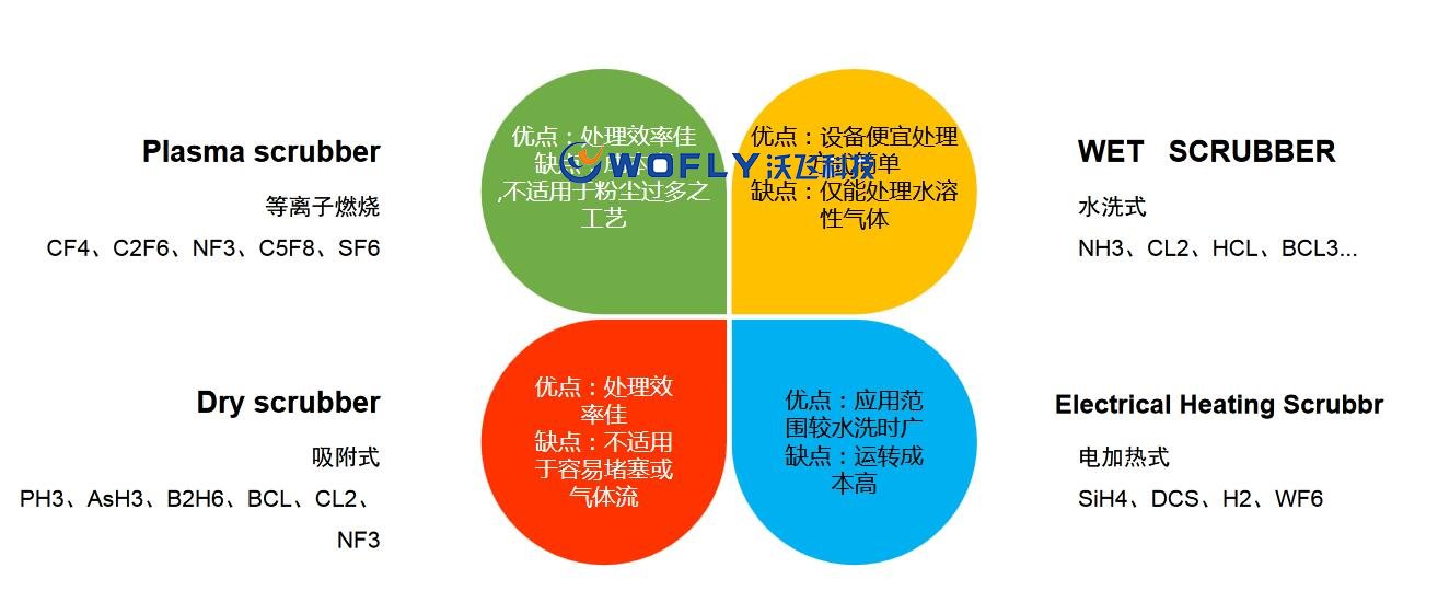 由于以上四種氣體對環境或人體皆具有一定的危害性,必須防止其直接排放大氣中,所以,一般半導體廠都以加裝大型中央廢氣處理系統.但此系統僅以水洗滌廢氣.故其應用范圍僅限于處理水溶性氣體,無法因應日新月異且分工細微的半導體工藝廢氣.因此必須依據各工藝所衍生出的氣體特性種類,選擇搭配相對應的廢氣處理設備,才能有效解決廢氣問題.而由于工作區域多半離中央廢氣處理系統前,常因氣體特性導致管路中結晶或粉塵堆積,造成管路堵塞后導致氣體泄漏,嚴重者甚至引起爆炸,無法確保現場工作人員之工作安全.因此在工作區域需配置適合工藝氣體特性的小型廢氣處理設備(Local Scrubber),以減少在工作區域滯留的廢氣,確保人員安全。