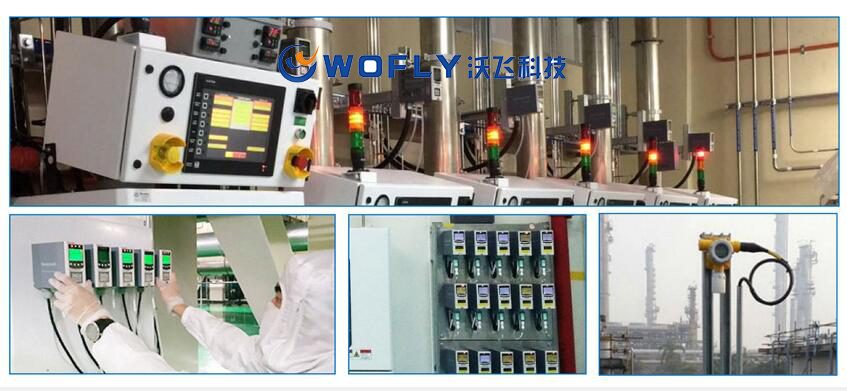 以可燃氣體檢測器為例,當氣體探測器檢測到空氣中的可燃氣體時,將氣體濃度的大小轉化為相應的4-20mA電流信號,由連接電纜傳送至深圳沃飛科技有限公司的監測報警控制系統,監測報警控制器再將電信號轉化為數字信號,在液晶顯示器上顯示出氣體的濃度值,當檢測值大于報警設定值時,便由蜂鳴器或警示燈發出報警信號,提示工作人員引起注意,或啟動連鎖排風系統。