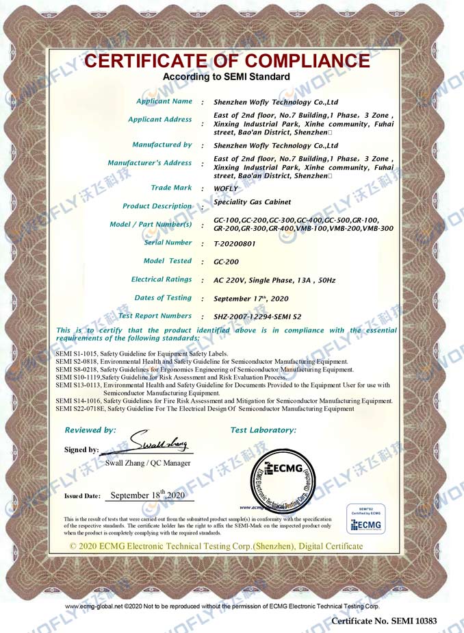 最后,沃飛WOFLY全自動特氣柜(GC)擁有SEMI S2認證,SEMI S2(Safety Guidelines for Semiconductor Manufacturing Equipment)是針對半導體制程設備供貨商所規范的基本健康和安全要求安全標準,代表了半導體廠家的基本安全要求。