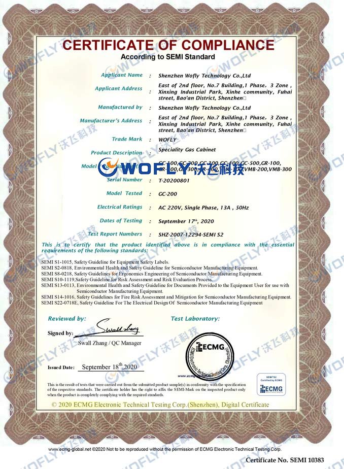因特種氣體的特殊性,承載特種氣體的氣瓶柜體須為防爆柜體,同時為保證半導體制程工藝中特種氣體的穩定供氣和安全,應具備多種功能,如柜內氣體泄漏偵測報警、PLC面板控制、全自動吹掃等,提高使用安全系數,有效的保護生產安全和人員的生命安全。其次,半導體行業配置電子特氣柜需要擁有SEMI S2認證。